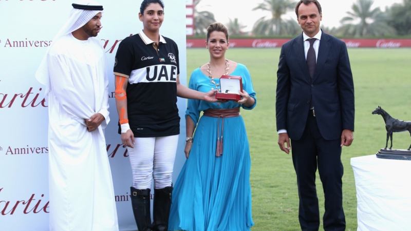 HRH Princess Haya Bint Al Hussein, Ali Al Bawardi and Regional Managing Director of Cartier Middle East, India and Africa Laurent Gaborit make a presentation to the teams on the final day of the Cartier International Dubai Polo Challenge 10th edition at Desert Palm Hotel on February 21, 2015 in Dubai, United Arab Emirates. (Photo by Chris Jackson/Getty Images for Cartier)