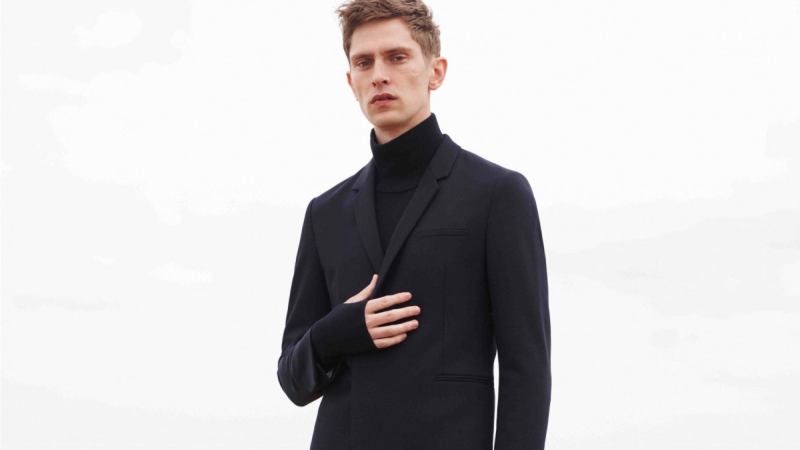 One ensemble we’re keen on? A navy merino wool top paired with a classic navy wool tailored jacket and trousers, finished off with a pair of black leather sneakers. It sure looks good to us.