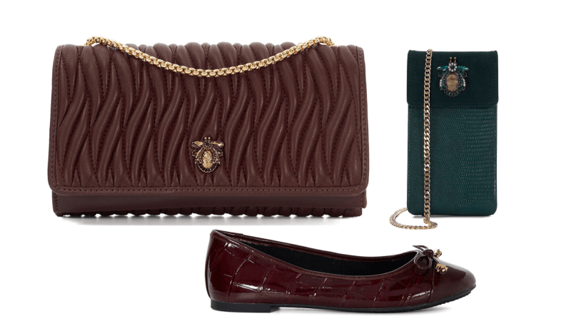 With a focus on trend-led textures and statement hues, look out for jewel tones like its new midnight cherry red and forest green, alongside the brand’s house leopard print, hand finished detailing and timeless croc and snake-effect.