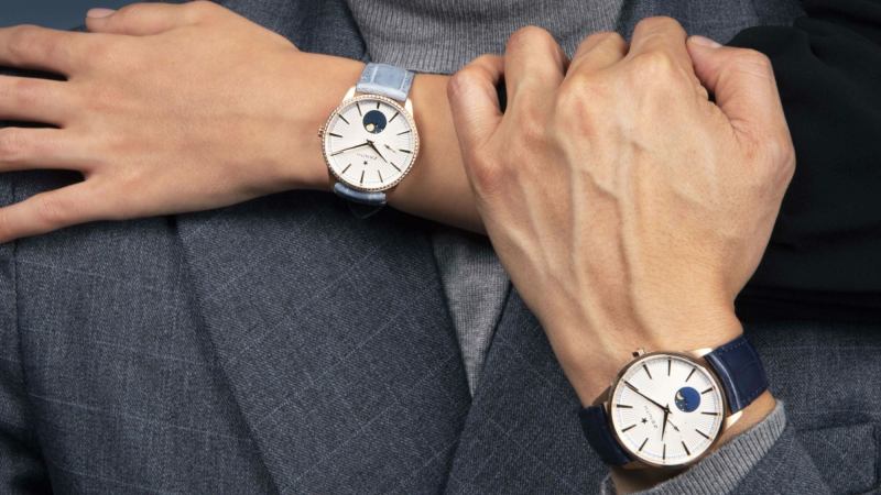 Meanwhile, the Elite Moonphase portrays a whimsical tone and asymmetry, with a midnight blue circle on the lower half on the sunburst pattern dial, indicating an oversized display of a golden moon and stars. With both models available in 40.5mm and 36mm case diameters in stainless steel or rose gold, the choice is left to the wearer.