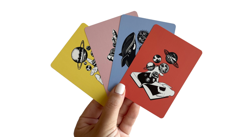 The Cosmic Conversations cards deck covers four different themes, each of which are color-coded, and are spread across 52 prompt cards. Two of these themes pertain to work-related topics, while the other two explore one’s personal life. The “Work Time” cards include questions about work habits, preferences, and experiences, whereas the “How’s Work?” ones are meant to enable open feedback with your teammates in order to foster trust. There are also cards that encourage more personal conversations titled “Story Time” and “What If…”
