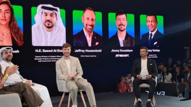 In the ensuing panel discussion, MrBeast talked alongside Jeffrey Housenbold, CEO, Beast Industries; Sunny Varkey, founder, Varkey Foundation; and H.E. Saeed Al Eter, Deputy Minister of Cabinet Affairs for Strategic Projects and the Chairman of the UAE Government Media Office.