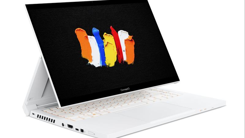 The ConceptD 3 Ezel is a convertible notebook designed especially for creative professionals. The device itself is a work of art boasting amber-backlit keys against a white, all-metal chassis, and a large glass trackpad that supports multi-finger gestures.