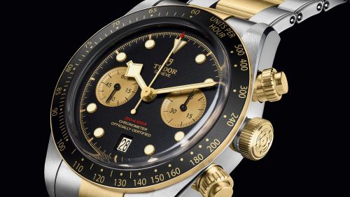 The renowned Black Bay family debuts the first Tudor chronograph, running on a self-winding manufacture caliber, with a column wheel and vertical clutch, in tones of steel and gold.